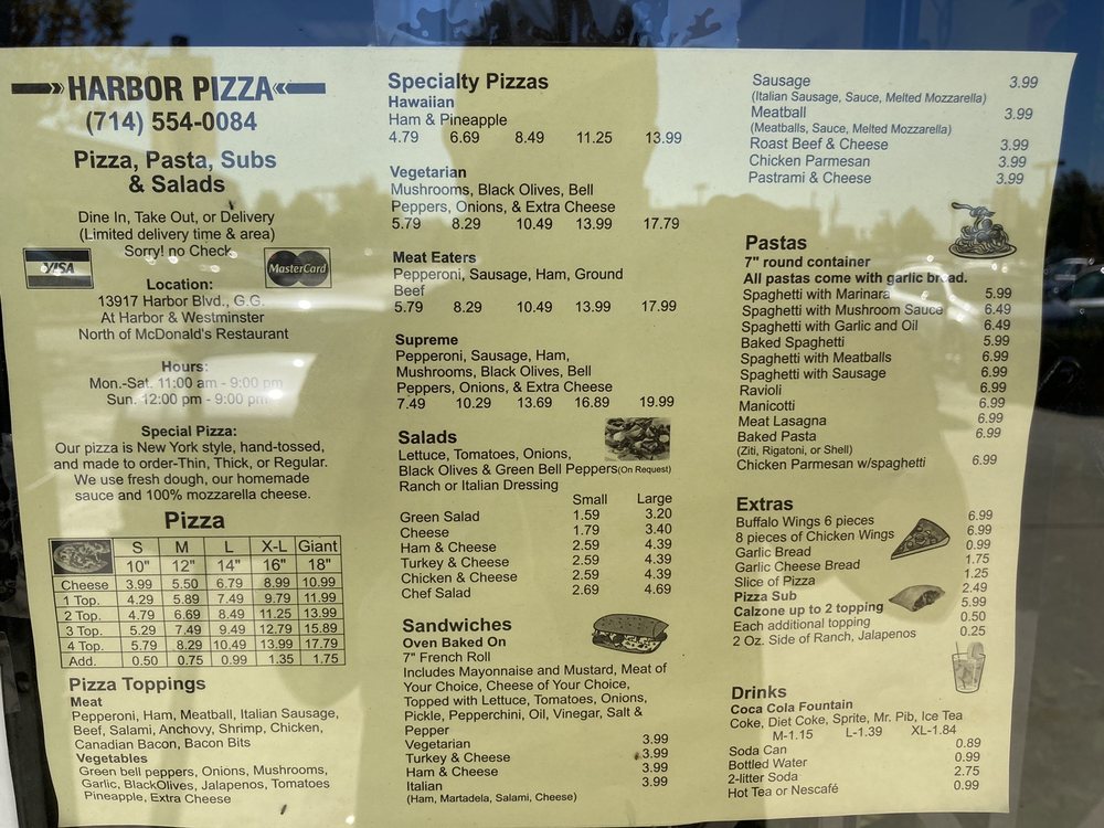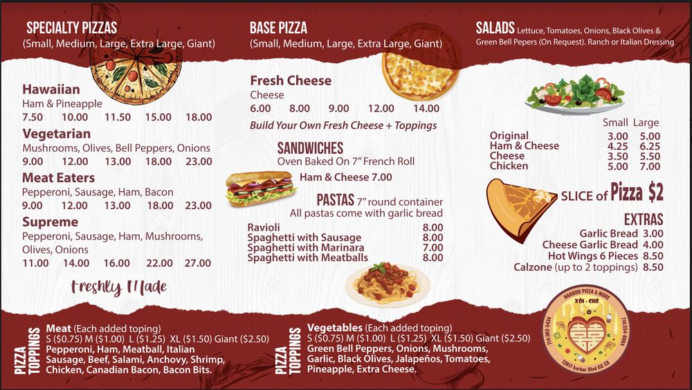 Welcome to Harbor Pizza & More, a hidden gem nestled at 13917 Harbor Blvd in Garden Grove, CA. This cozy Italian eatery specializes in tantalizing pizzas that are as affordable as they are delicious. The standout offering is the build-your-own fresh cheese pizza, priced at just $7.20, allowing you to customize it with a variety of fresh toppings. For those seeking something different, try the hearty 2 Toppings Calzone or a refreshing salad, like the Chicken Salad at $6.00.